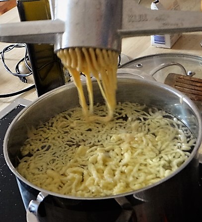 Spätzleteig herstellen aus 3 Eiern, Mehl, Salz und kaltem Wasser, Alle Zutaten ordentlich verrühren und schlagen bis sich Blasen bilden, durch eine Spätzlepresse in kaltes Wasser drücken, solabald die Spätzle nach oben steigen mit einer Kelle herausnehmen, (man kann sie in Eiswasser abschrecken und anschließend in einer Pfanne kurz braten),