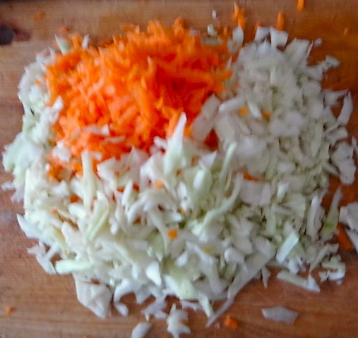 Weißkohl und eine Möhre fein hobeln, dazu kommt eine gedünstete